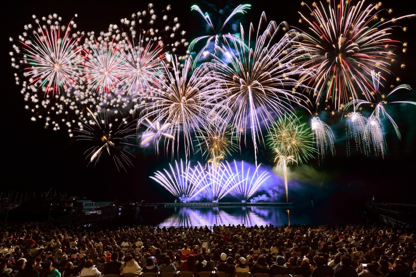 The large, 300m diameter 1 shaku bonfires instantly light up the night sky, creating a vibrant display that brightens up the spring night sky.