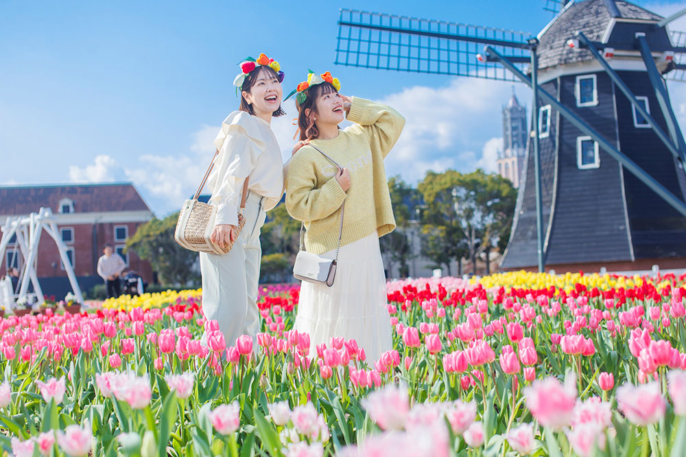 チューリップに囲まれたなかで可愛らしい写真を撮れるフォトスポットが登場。青空と異国情緒の街並みを背景に旅の思い出を撮影しませんか。