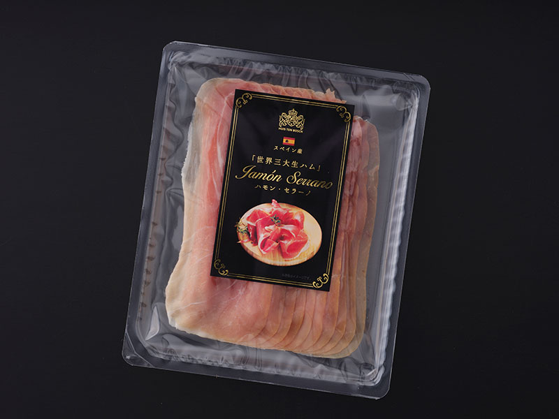 Jamon Serrano from Spain is one of the world's three great prosciuttos. It is characterized by its moderate saltiness and concentrated flavor, and is perfect not only as a snack but also in salads.