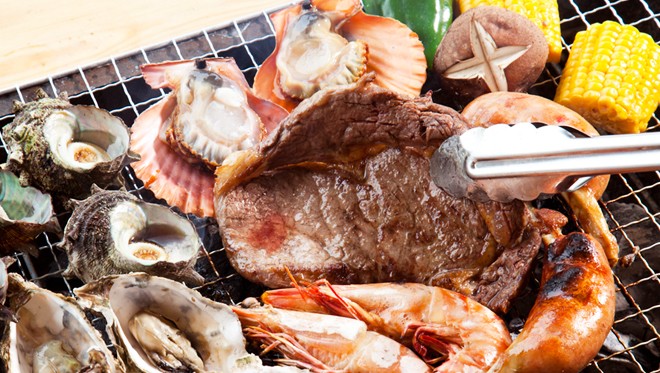 Nagasaki Wagyu and fresh seafood grilled over charcoal at a canal-side BBQ terrace