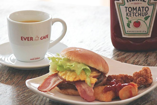 Enjoy a hearty Sasebo burger on the bayside with a pleasant sea breeze.