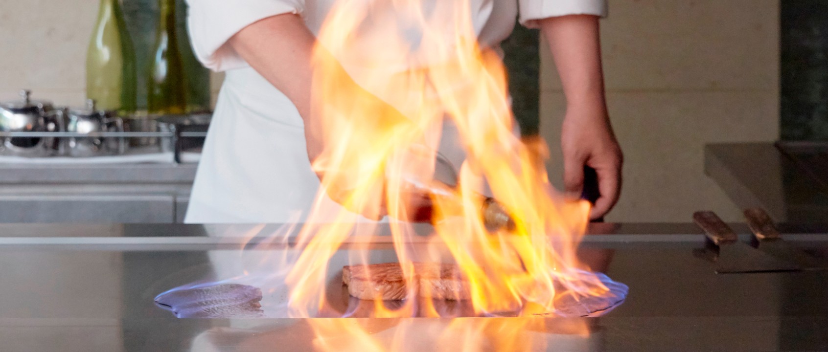 Enjoy teppanyaki with carefully selected ingredients from Kyushu area, including Nagasaki Wagyu beef that is known for taste change depending on how its grilled is chowcased by the skilled chefs in front of guests. Enjoy a moment of bliss and the finest taste.