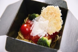 Tomato pasta topped with cheese, cherry tomatoes, and broccoli.