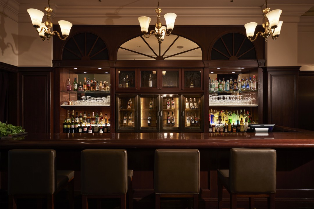 An elegant and heavy wood grain interior and a chic, warm and relaxing bar.
