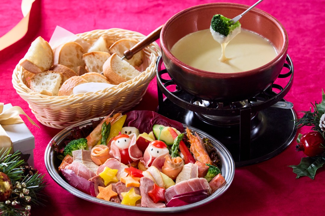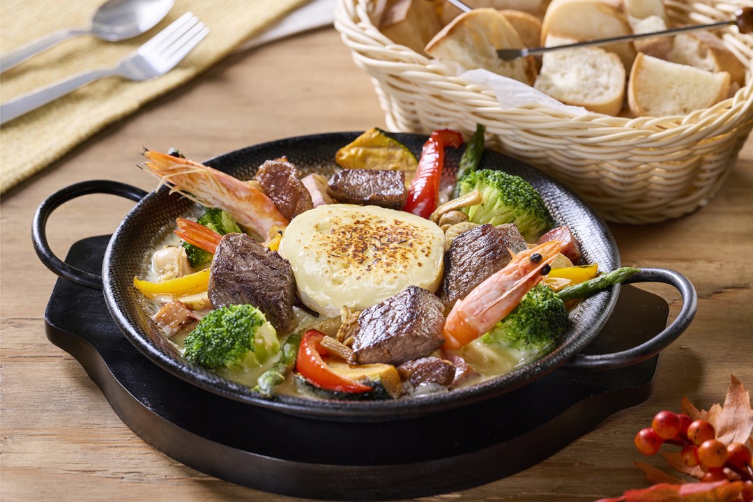 This cheese fondue is made by grilling a whole Camembert cheese from Kumamoto Prefecture and serving it with colorful ingredients in a paella-style style. It's a dish that will warm your body and soul.