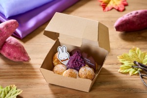 Poffertjes, a traditional Dutch pastry from Miffy 's home country, is topped with caramel sugar and dipped in purple sweet potato paste for a touch of autumn.
