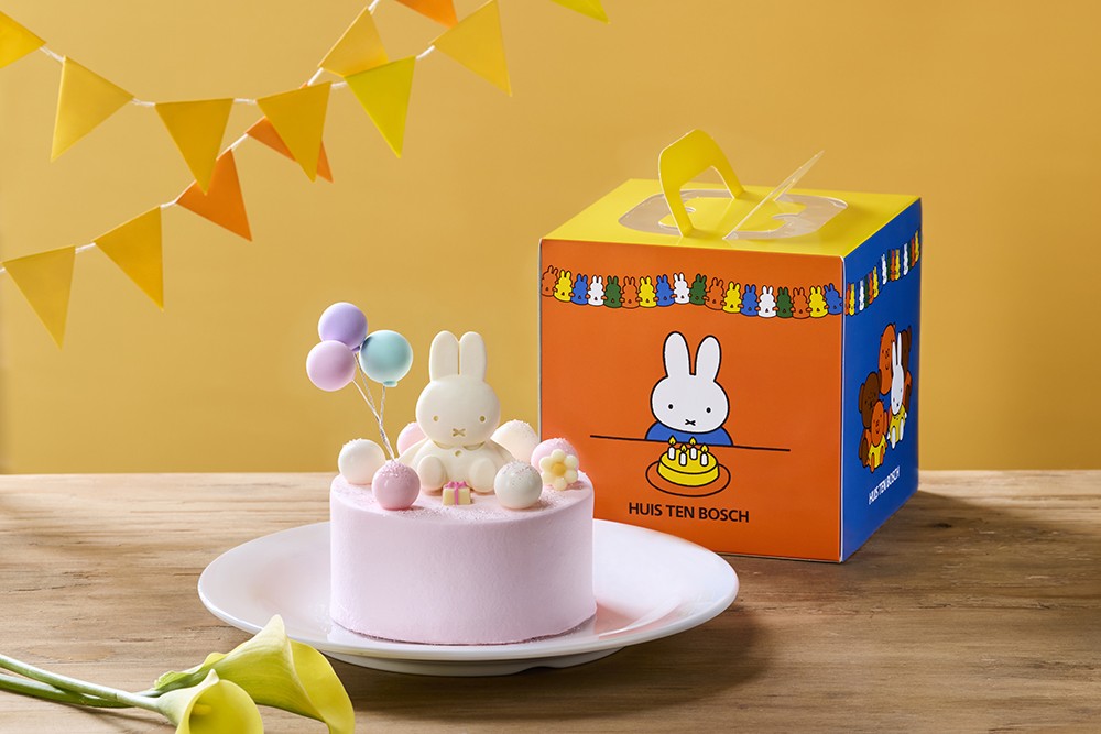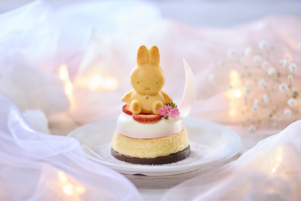 ミッフィーとメラニーがのったお花のケーキをイメージしたハンバーグと、その周りをチーズのミッフィーやくまちゃん・ハムのリボンやお花で装飾したサラダで彩られたプレート。