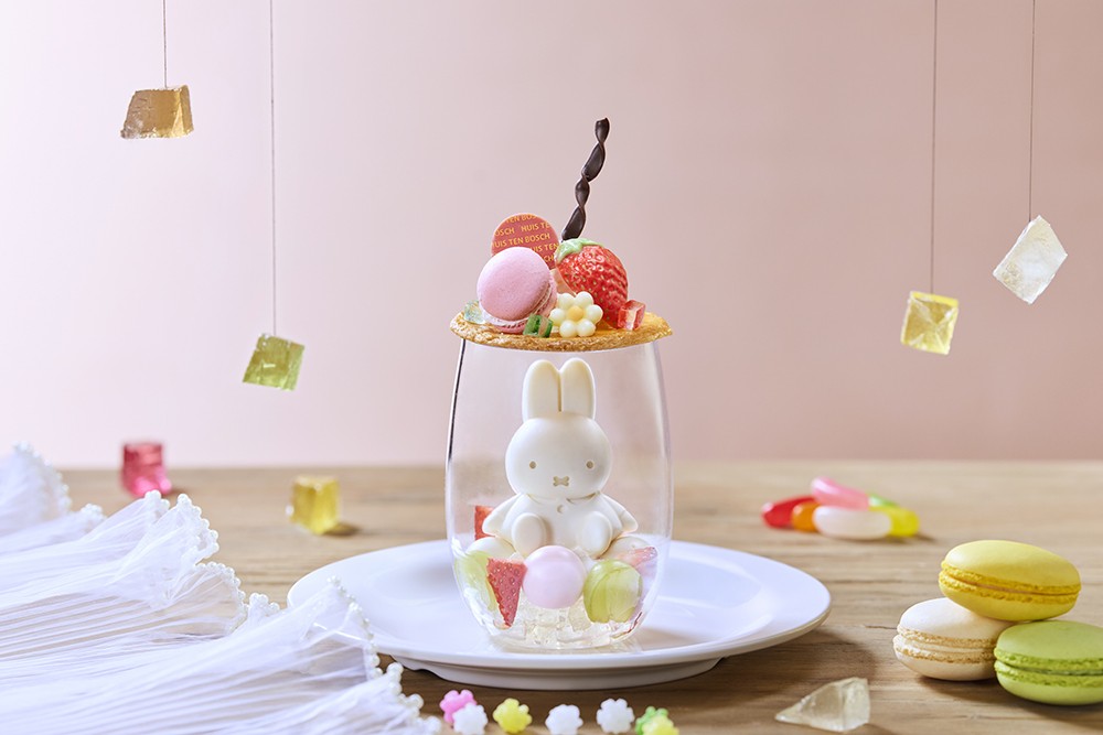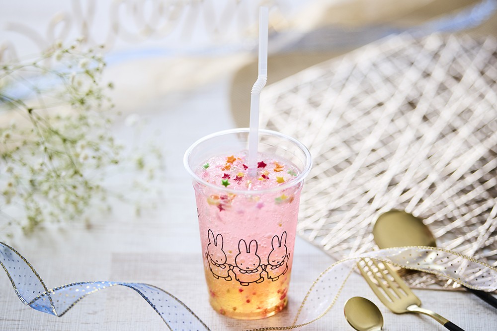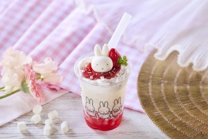 中央にミッフィーのマシュマロが乗った 苺ジュレとラッシーの2層になったドリンク