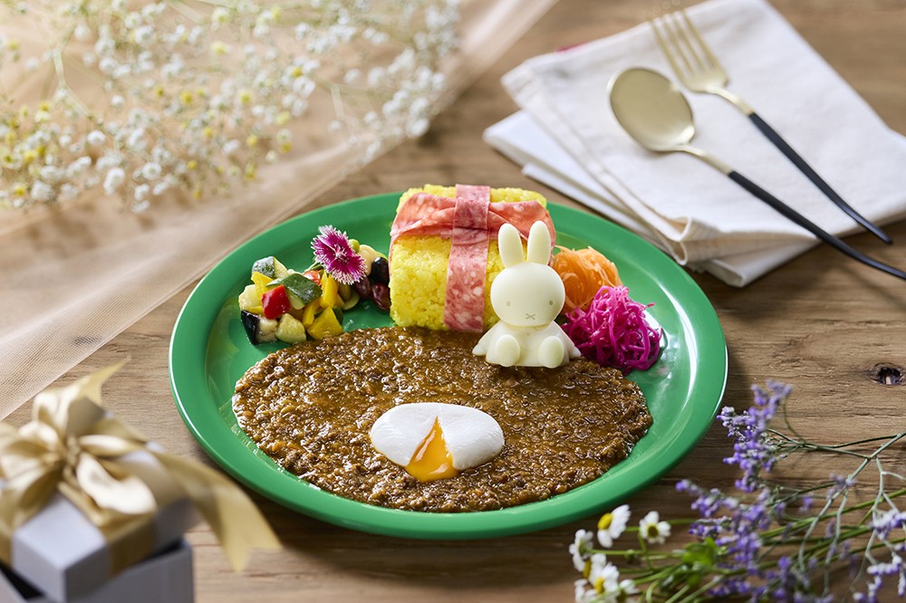 お空で遊ぶミッフィーとメラニーをデコレーションしたとろとろオムライスと、ゴロっとお肉のビーフシチュー。