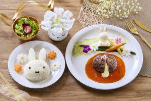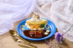 A soft and creamy omelet rice decorated with Miffy and Melanie playing in the sky, and beef stew with chunks of meat.