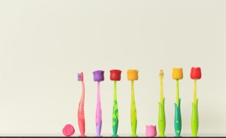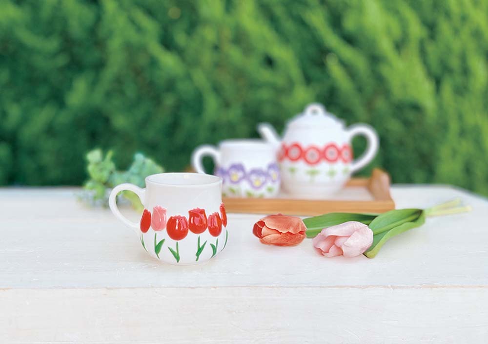 Available in four colors: pink and gray with windmill and Tulip motifs, and yellow and green with rose motifs.